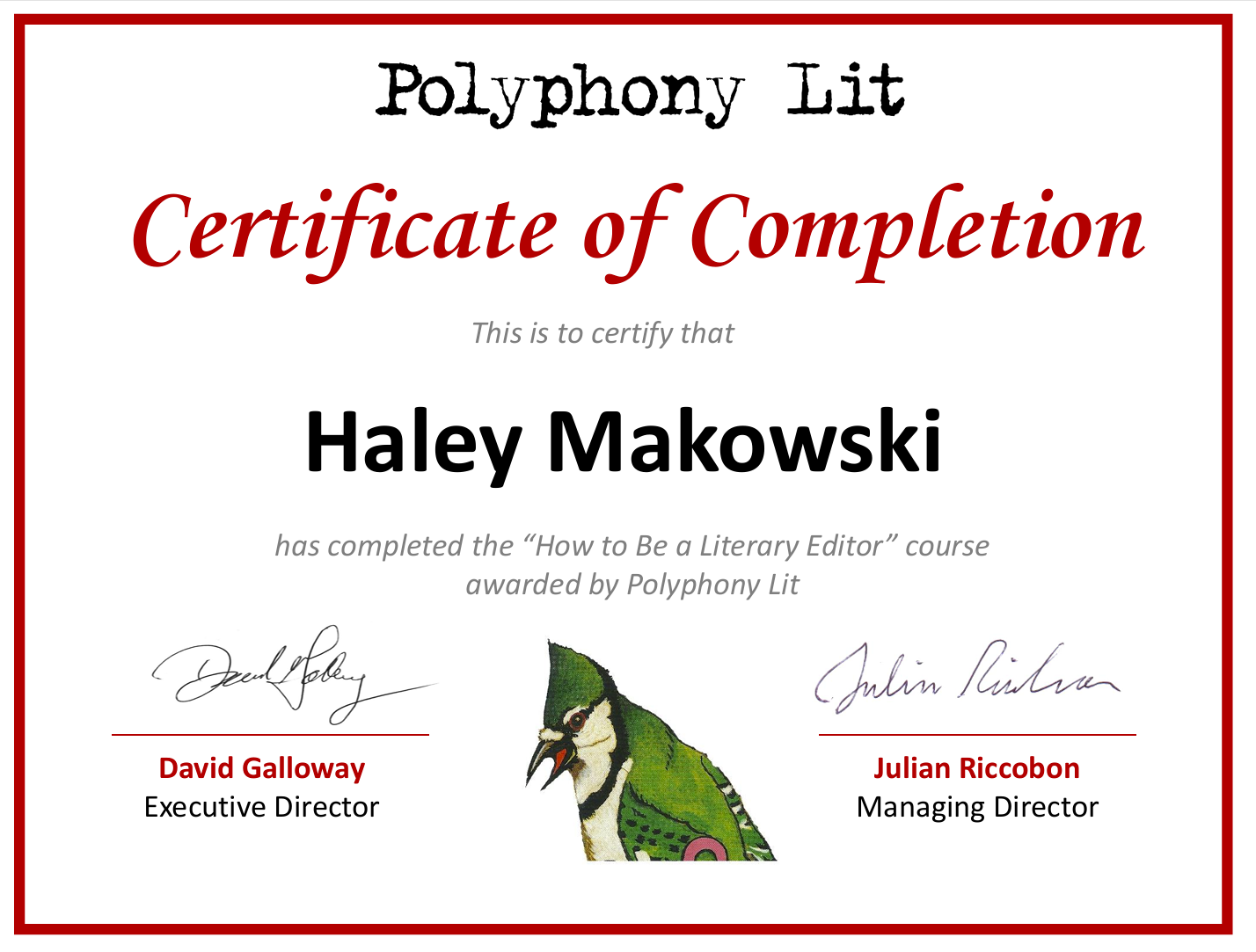 Polyphony Lit presented me an opportunity in my late high school years to develop skills in literary editing and learn about the ever-important editor/writer relationship. In order to be a volunteer editor, I completed an online workshop called "How to Become a Literary Editor" (see certificate below).